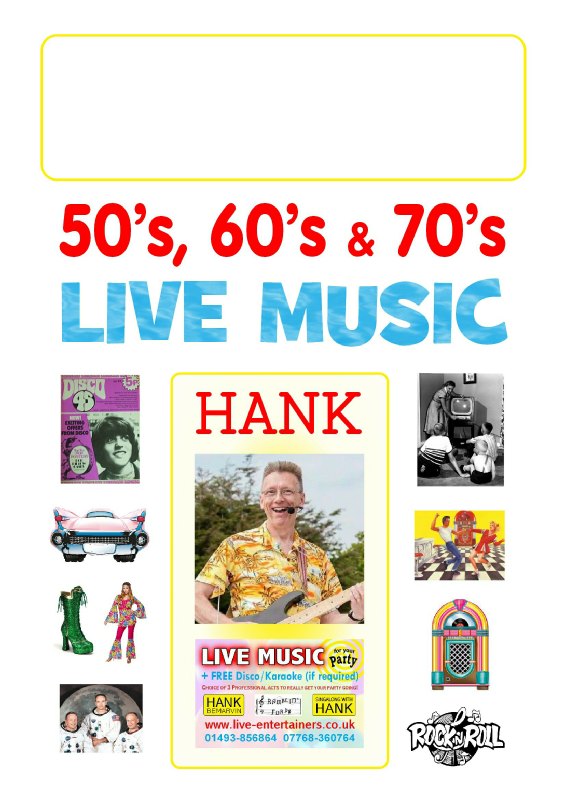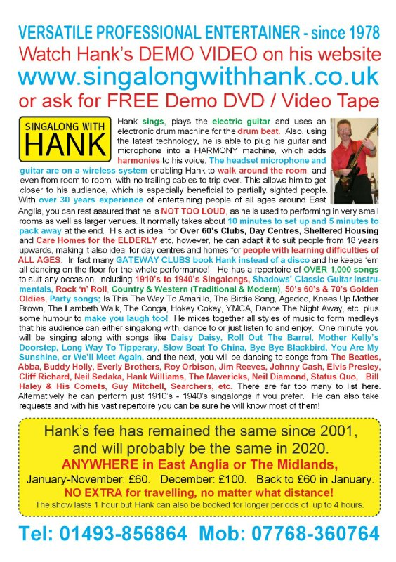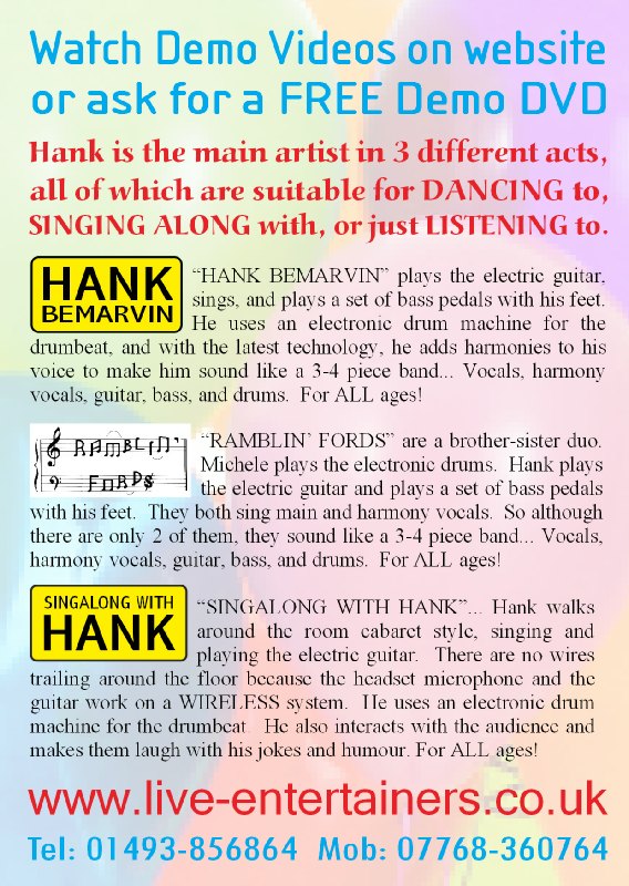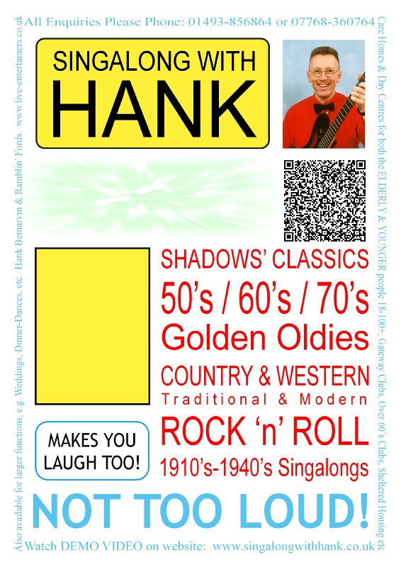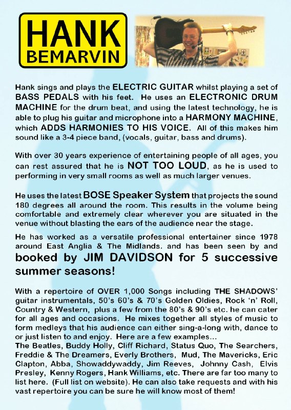 Posters and Publicity Material Live Music for your party flyer (back) Hank Bemarvin flyer (front) Hank Bemarvin flyer (back) Click on the thumbnails to open up a full size high quality image that you can print out. Singalong with Hank poster Hank Bemarvin poster thumbnail Singalong with Hank flyer (front) Singalong with Hank flyer (back)